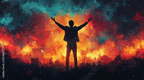 Silhouette of a man celebrating amidst colorful explosion background