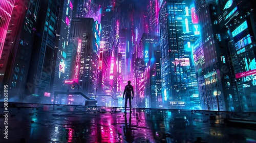 Silhouette of a man facing a cyberpunk cityscape bathed in neon lights