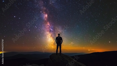 Silhouette of a Man Gazing at the Milky Way over a Mountain Range at Night