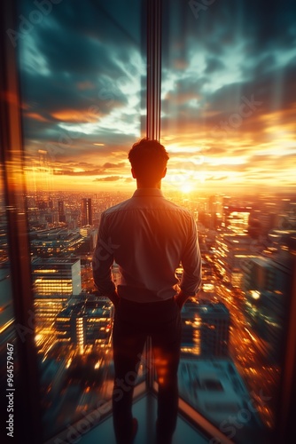 Silhouette of a man gazing out at a vibrant sunset over a city skyline.