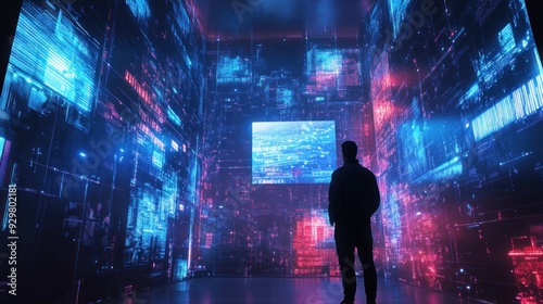 Silhouette of a Man in a Room with Glowing Digital Walls
