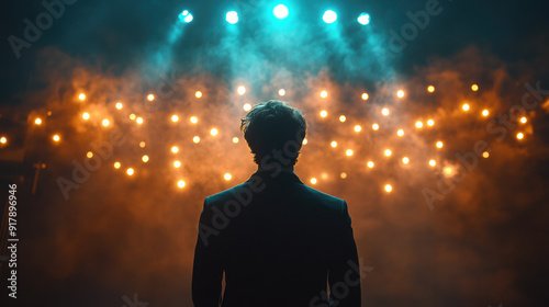 Silhouette of a man in a suit standing on a stage with dramatic lighting, facing a backdrop of bright blue and orange lights.