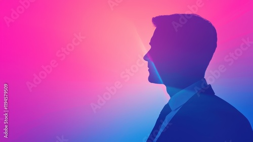 Silhouette of a man in profile against a vibrant pink and blue background.