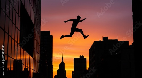 Silhouette of a man leaping between buildings against a vibrant sunset sky in an urban setting.