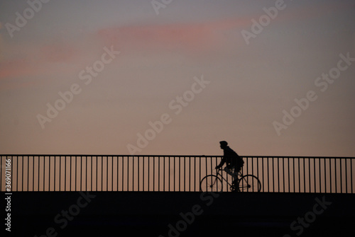 Silhouette of a man on a bicycle crossing a bridge at sunset