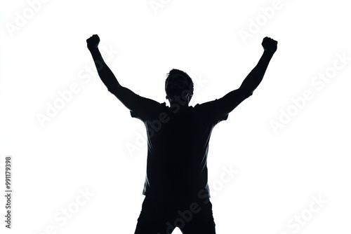 Silhouette of a man raising both arms in a triumphant pose, celebrating against a bright white background. The scene captures energy, excitement, and victory..