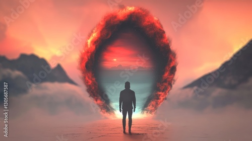 Silhouette of a man standing before a fiery portal revealing a serene landscape. Surreal and dramatic.
