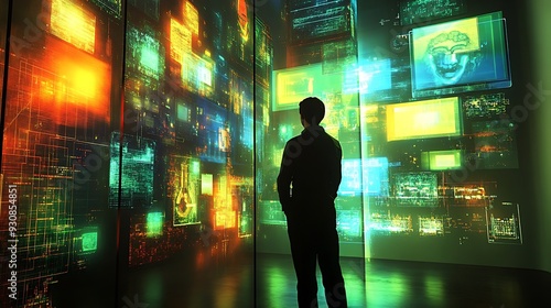 Silhouette of a Man Standing Before a Wall of Digital Screens with Abstract Green and Orange Patterns.