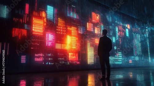 Silhouette of a man standing in front of a large digital wall displaying vibrant data and colorful abstract graphics conveying technological analysis