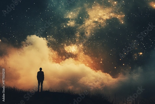 Silhouette of a man standing on a hilltop under a starry sky with bright clouds and nebula. Concept of wonder, mystery, and exploration.