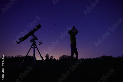 Silhouette of a man, telescope and countryside under the starry skies.