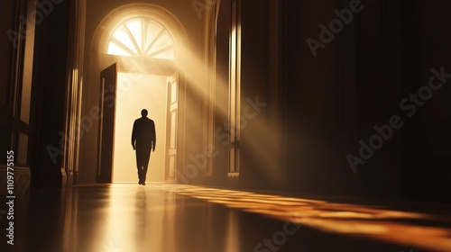 Silhouette of a man walking towards a bright doorway in a dark hallway.