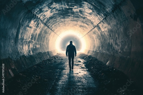 Silhouette of a Man Walking Towards a Bright Light at the End of a Tunnel