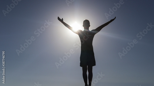 silhouette of a man with open arms raised in an attitude of triumph, from behind you can see the brightness of the sun, the sky is clear and blue