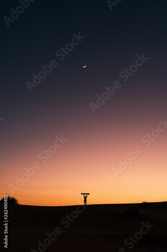 Silhouette of a man with snowboard in the Sahara desert, sunset and moon