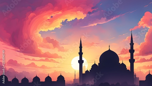 Silhouette of a mosque against a vibrant sunset sky with dramatic clouds.
