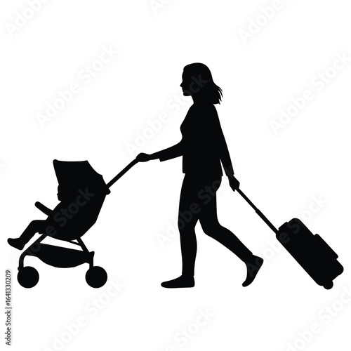 Silhouette of a mother pushing a baby in a stroller and pulling a suitcase, isolated on white background