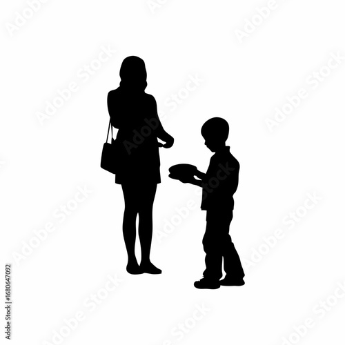 Silhouette of a mother serving food to her son at a dining table