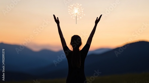 Silhouette of a Person Celebrating at Sunset with Sparkler, Scenic Mountains and Sky, Capturing the Essence of Joy and Freedom in Nature's Embrace