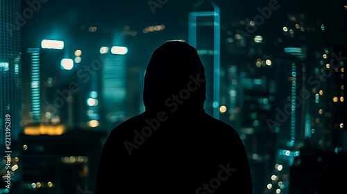 Silhouette of a person in a hoodie against a vibrant city skyline at night
