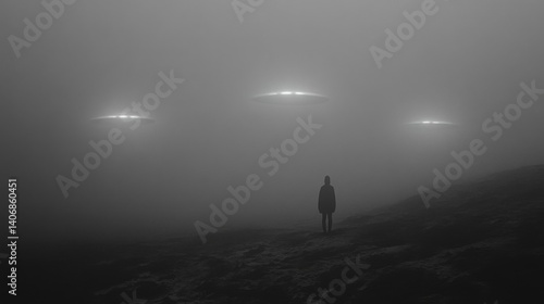 Silhouette of a Person in Fog with Distant Lights