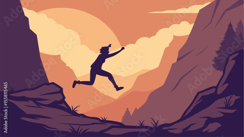 Silhouette of a person jumping between mountain peaks at sunset with clouds and trees in the background landscape