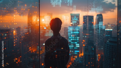 Silhouette of a person looking at a city skyline through a window with digital data holograms during sunset.
