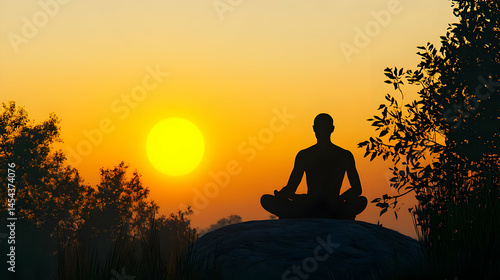 Silhouette of a person meditating at sunrise. A figure sits in lotus position on a rock, facing away, in the golden hour light, amidst a tranquil landscape