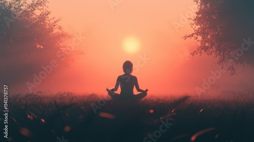 Silhouette of a person meditating at sunrise in a misty field, surrounded by trees. Perfect for websites, blogs, or social media promoting peace, mindfulness, and serenity.