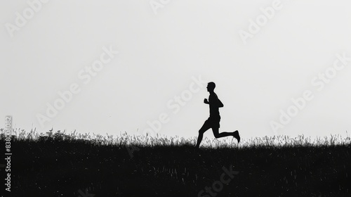 Silhouette of a person running on a grassy field. The runner is in mid-stride, with one arm bent and the other extended, suggesting movement