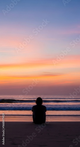 Silhouette of a person sitting on the beach at sunset, gazing at the colorful sky and ocean waves
