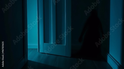 Silhouette of a person standing in a dark hallway, with an open door in the background.