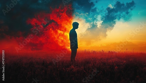 Silhouette of a person standing in a field with dramatic contrasting clouds of red and blue during sunset evoking a mood of contemplation and intensity