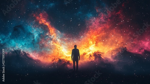 Silhouette of a person standing in a vibrant cosmic landscape with swirling colors and stars