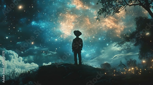 Silhouette of a person stands on a hill under a starry night sky.