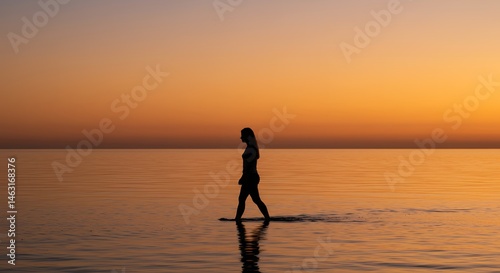 Silhouette of a person walking in shallow water during a peaceful orange sunset