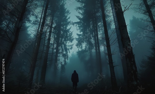 Silhouette of a Person Walking Through a Foggy Forest at Night