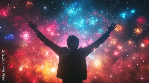 Silhouette of a person with arms raised against a vibrant, colorful nebula background, symbolizing awe and wonder.