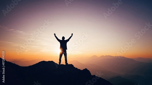 Silhouette of a person with arms raised in the air on a mountaintop, facing the sunset.