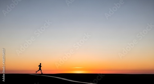 Silhouette of a runner on a road at sunset, embodying concepts of fitness, perseverance, achieving goals, and the beauty of nature.