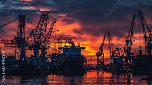 Silhouette of a shipyard with cranes and cargo ships, twilight setting, dramatic sky