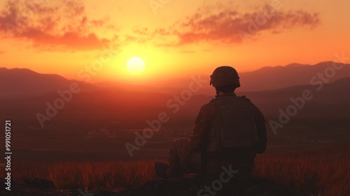 Silhouette of a soldier sitting on a hilltop, looking at a sunset over a mountain range.