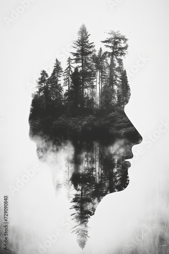 Silhouette of a Soul: Contrast of a Singular Expression and Natures Majesty, double exposure portrait of serene face of a person amidst backdrop of majestic trees.