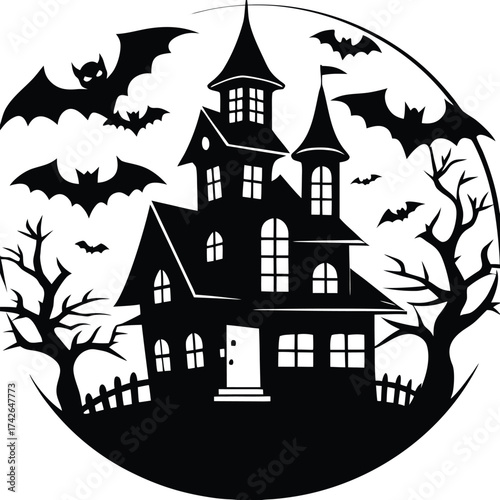 Silhouette of a spooky haunted house with bats