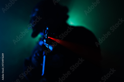 Silhouette of a tactical figure aiming with laser sight in dramatic lighting
