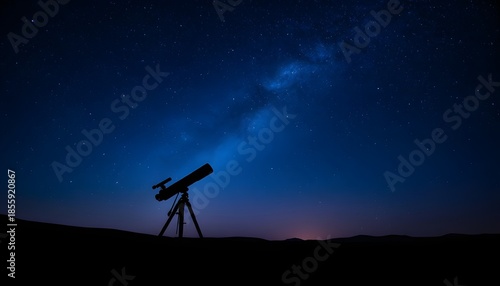 Silhouette of a telescope against a deep blue night sky filled with the Milky Way galaxy and countless stars for astronomical research and space discovery.