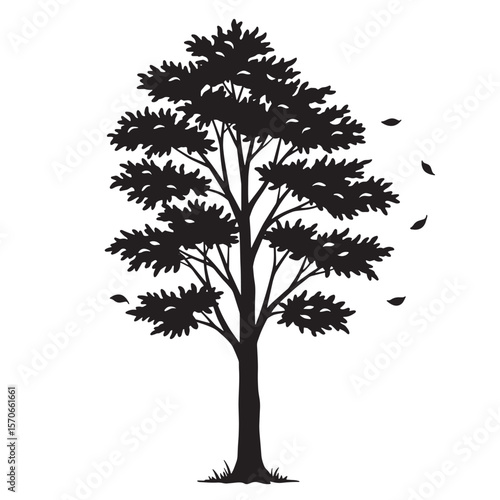Silhouette of a tree with falling leaves black and white isolated on white background