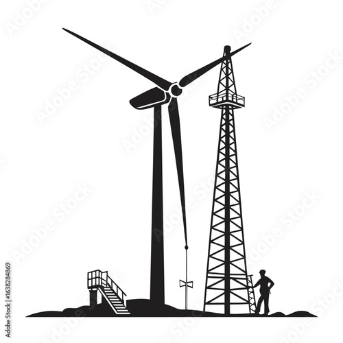Silhouette of a wind turbine under construction with a lattice tower and a worker, representing renewable energy industry