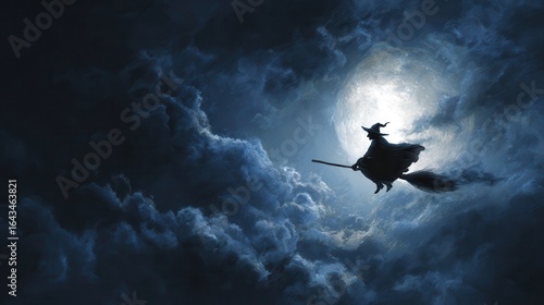 Silhouette of a Witch Flying on a Broom Through Night Sky with Full Moon
