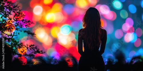 Silhouette of a Woman Against a Background of Colorful Bokeh Lights